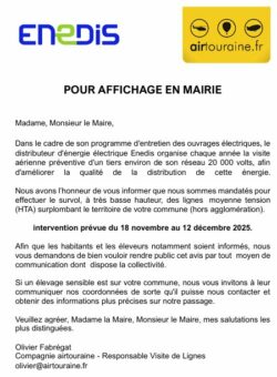 Les sociétés ENEDIS et AIR TOURAINE vous informent qu’entre le 18 novembre et le 12 décembre 2025, un survol de notre commune est programmé dans le cadre de la surveillance des lignes HTA.