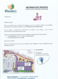 Merci de prendre connaissance de l’information de travaux relatif au marquage au sol de la place des Halles prévu ce lundi 30 et mardi 31 mars 2026.