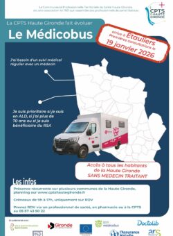 Face à la désertification médicale et aux difficultés rencontrées par les habitants de la haute gironde, le médicobus propose des consultations médicales (seront prioritaires les patients de plus de 70 ans et/ou en affection de longue durée (ALD)), réduisant ainsi les distances et les délais d’attente.