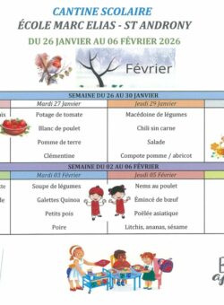ST-ANDRONY – MENU DU RESTAURANT SCOLAIRE DU 26/01 AU 06/02 Publié le mercredi 28 janvier 26 Temps de lecture1' Menu du restaurant scolaire 26 janvier au 06 février. Application INTRAMUROS