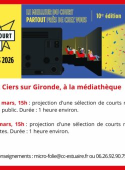 Mercredi 25 mars, 15h : projection d’une sélection de courts métrages pour le jeune public. Durée : 1 heure environ.