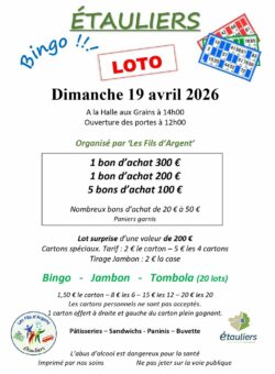 Grand Loto dimanche 19 avril 2026 – Salle des Fêtes ÉTAULIERS