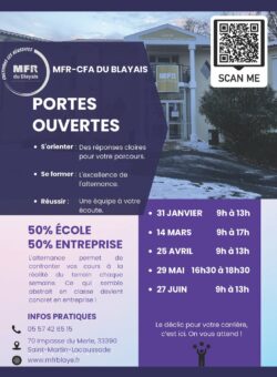 Retrouvez ci-dessous les dates des portes ouvertes de la MFR du Blayais :