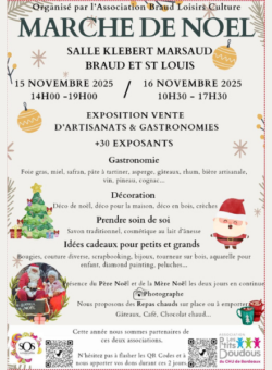 Le Marché de Noël du Braud Loisirs Culture est de retour ! De supers exposants à découvrir cette année ! Pleins de nouveautés pour petits et grands : foie-gras, miel, vin, couture, bijoux, déco de noël, cosmétiques…