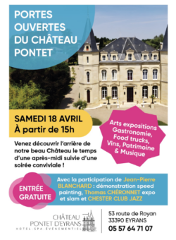 Cette journée débutera dès 15h avec une exposition d’art et une démonstration de speed painting et continuera toute la soirée avec nos viticulteurs et traiteurs qui seront sur place pour vous faire vivre une soirée conviviale, animé par un groupe de musique, dans le parc du château !