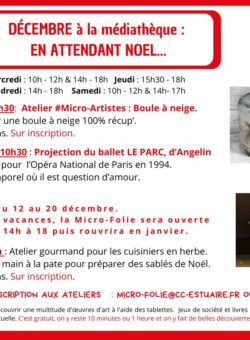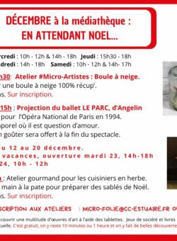 Mardi 23 à 15h : Atelier gourmand pour les cuisiniers en herbe. Viens mettre la main à la pate pour préparer des sablés de Noël. A partir de 6 ans. Sur inscription.