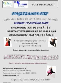 L’association Tak’danser propose un stage de Quick Step, samedi 10 janvier 2026, à la salle des fêtes de Saint-Ciers-sur-Gironde, ouvert à tout public, licencié ou non à un club de danses de salon.