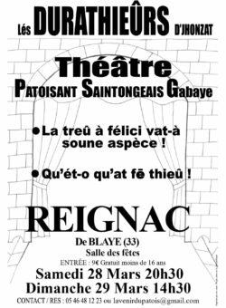Nous vous attendons nombreux pour venir assister aux représentations de Théâtre patoisant des DURATHIEURS D’JHONZAT, à vos téléphones pour vous inscrire au 0546481223.