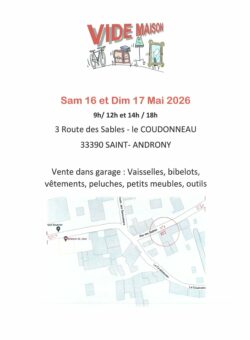 Du 16 mai 17 mai Publié le mercredi 22 avril 26 Temps de lecture1' Vide maison 16 et 17 mai à Saint-Androny Application INTRAMUROS Vide maison au 3 route des sables le 16 et 17 mai. Localisation : Saint-Androny