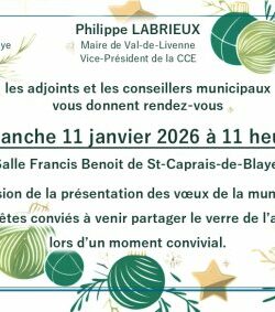 Vous êtes conviés à venir partager un moment convivial à l’occasion de la présentation des Vœux de la Municipalité de Val-de-Livenne.